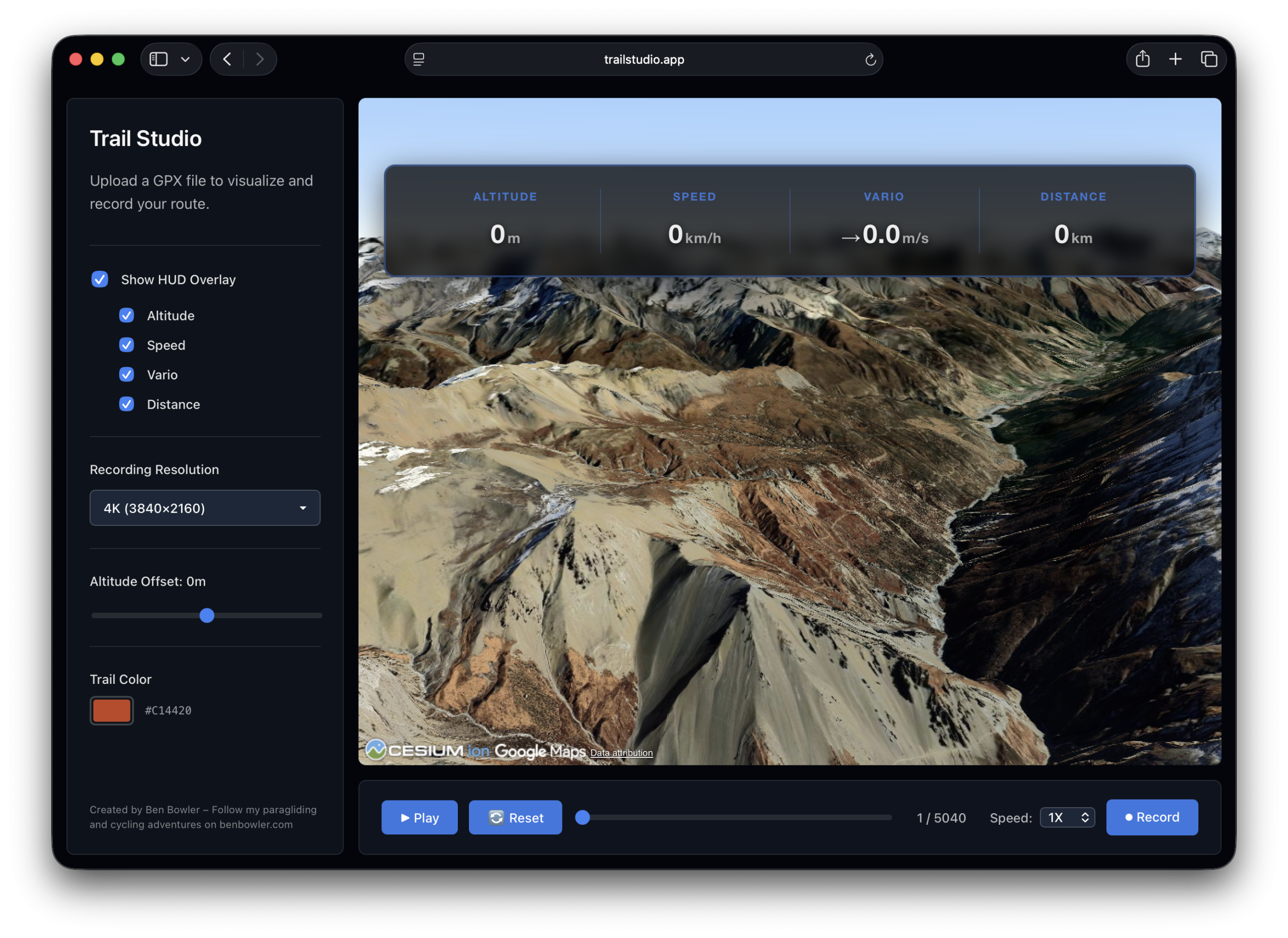 Google Earth Studio, but for GPX tracks – a web-based app that uses Google photorealistic map tiles to record your adventures in full high bitrate 4K. Currently free for all, made for my videos over on BenBowlerAdventures on YouTube.
